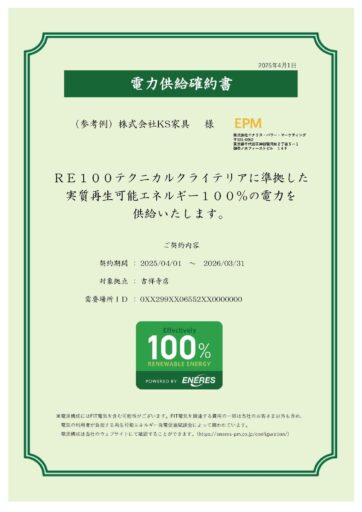 また、エナリスさんからはCO2ゼロの電気を使っていることがわかる電力供給確約書をいただきました。下関工場では玄関に飾っており、来客への効果もありますし、従業員の社内意識向上にもつながっていると思います。