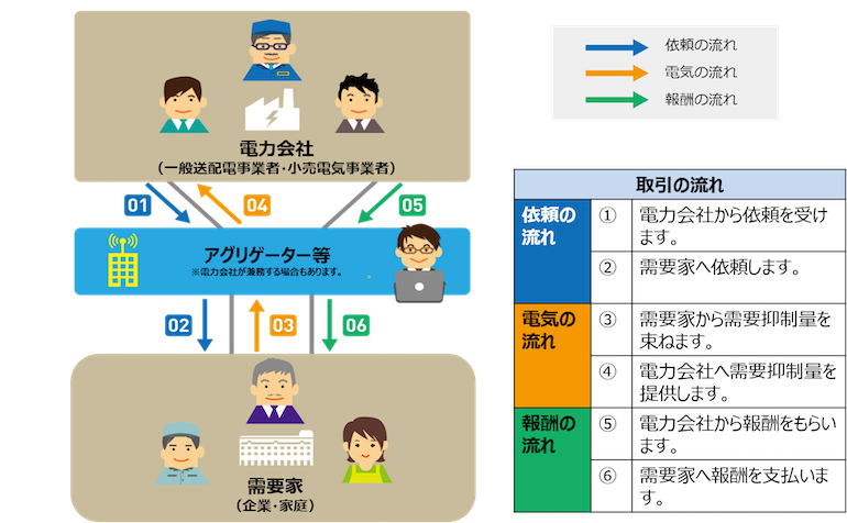 あらかじめ、アグリゲーター等とデマンドレスポンス契約を結んだ電力ユーザーが、電力がひっ迫しそうな時などに、電力会社からの要請に従って節電などを行い、達成することで報酬(インセンティブ)を得る仕組みです。また、インセンティブ型の下げDRはネガワット取引とも呼ばれています。