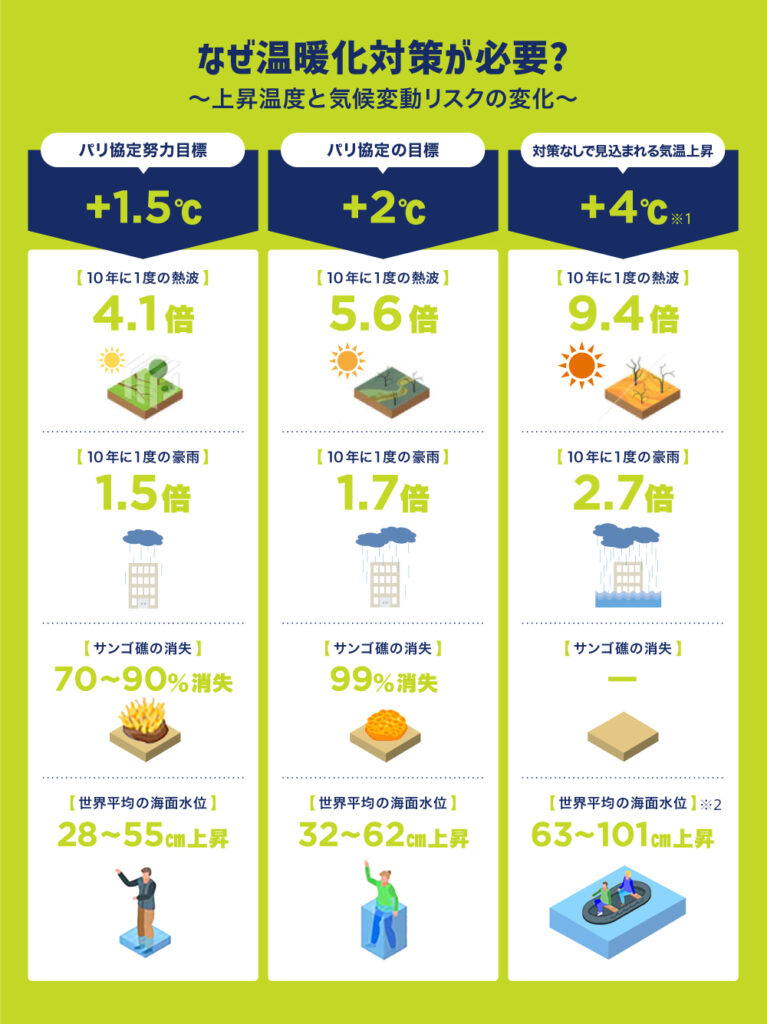 気候変動に関する政府間パネル(IPCC)では、温暖化のさまざまなシナリオを想定しています。産業革命前と比べて21世紀末までの世界平均の気温上昇を産業革命前に比べて「1.5℃以下」「2℃未満」「4℃未満」と抑える場合、それぞれの影響が大きく異なります。