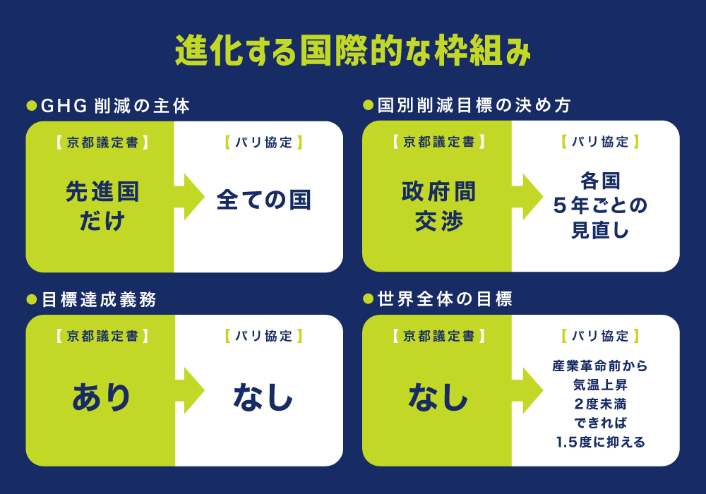 地球温暖化対策に関する国際的な枠組みとして、重要なターニングポイントとして知られているのが京都議定書とパリ協定の2つです。