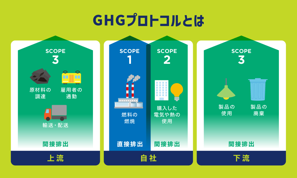 その排出量算定の際に活用される国際的なスタンダードの一つが「GHGプロトコル」です。このガイドラインをもとに、自社はもとより、サプライチェーン全体の排出量の算定が行われます。GHGプロトコルでは、排出量を以下の3つのスコープに分類しています。