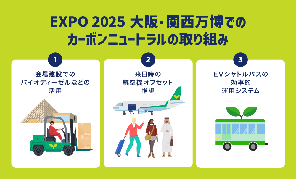2025年4~10月に開催される関西・大阪万博では、脱炭素・資源循環に関して目指すべき方向性や核となる対策の候補をまとめたグリーン・ビジョンが作成されました。