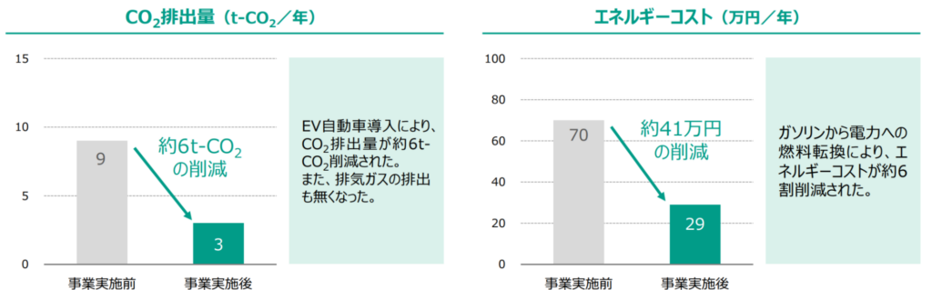 あるタクシー会社では、従来のLPG車を電気自動車(EV)に切り替える取り組みを進めました。これにより、CO2排出量が3分の1に減りました。さらにエネルギーコストも約60%削減しています。