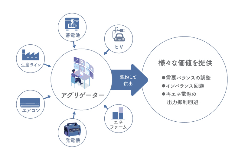 こうした状況の改善に役立つのが「アグリゲーター」です。アグリゲーターとは、一般送配電事業者等からの指令を受け、様々なエネルギーリソースを取りまとめて制御する「司令塔」のような役割を担う存在です(Aggregateは「集める・束ねる」を意味する英単語)
