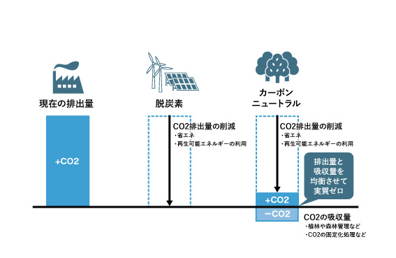 上の「カーボンニュートラル」の図をご覧ください。「+CO2」が、排出している二酸化炭素をはじめとする温室効果ガスの量で、「-CO2」が、植林等を通じて吸収している二酸化炭素をはじめとする温室効果ガスの量を示しています。図からわかるように、温室効果ガスの排出量と吸収量を均衡させて、全体として排出量を実質ゼロにするのがカーボンニュートラルの考え方になります。