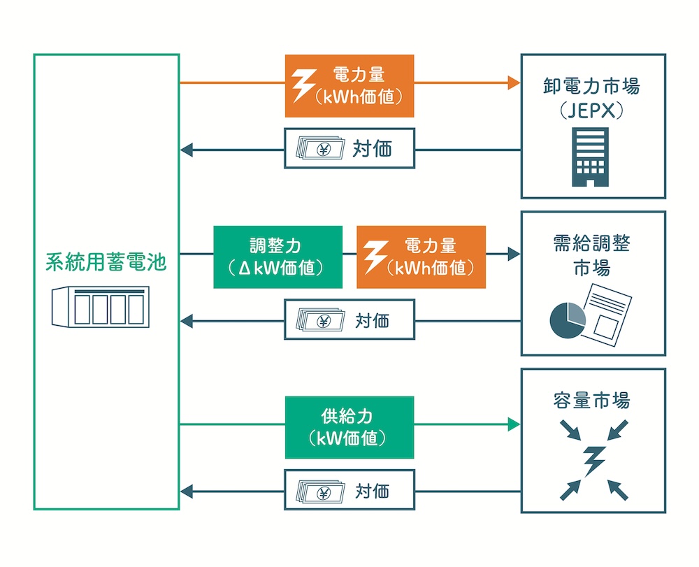 具体的には、容量市場で取引するのは「電力量(kWh)」ではなく「供給力(kW)」となります。供給力とは、必要なときに電気を供給する能力のことを指します。系統用蓄電池を活用して容量市場に参加することが可能で、蓄電池の出力を「発電能力の価値(kW価値)」として取引することで収益を得ます。