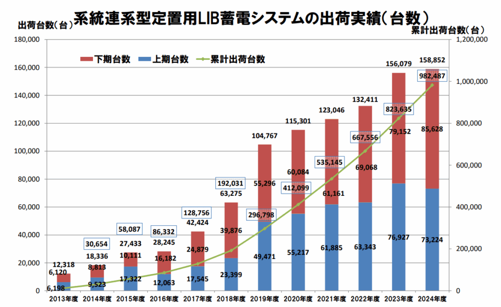 上記のグラフは日本電気工業会に参加した17企業における調査ですが、実際に系統用蓄電池の出荷台数は年々増加しています。