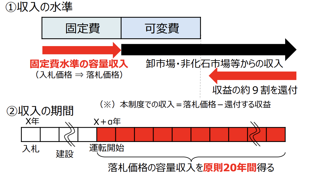長期脱炭素電源オークションでは、市場管理者が落札事業者に対して発電所の建設や運営に必要な費用の一部を長期にわたって支払います。これにより発電事業者は長期的な収益を予測しやすくなり、脱炭素電源を建設する投資判断がしやすくなります。