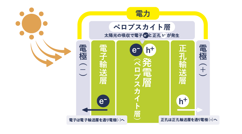 電子はマイナス、正孔はプラスの性質を持っており、光が当たることで電子は電子輸送層を通ってマイナスの電極へ、正孔は正孔輸送層を通ってプラスの電極へ、それぞれ移動します。この移動によって電流が生じて電力が発生する仕組みになっています。