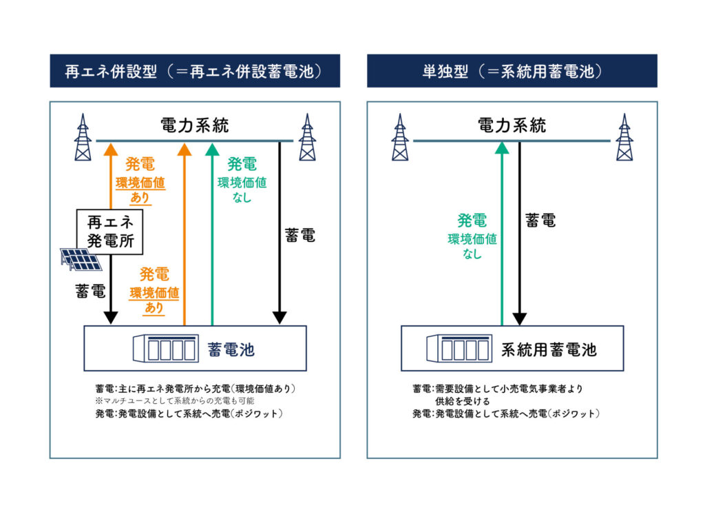 | 単独設置型(=系統用蓄電池) | 再エネ発電所とは独立して設置。系統からの電力を蓄電。 |