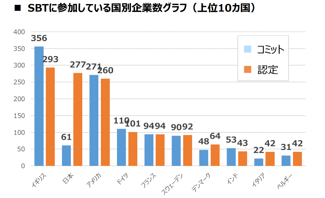 環境省が発行している「SBTに参加している国別企業数」によると、2022年10月現在でSBT認定を取得している企業は、イギリスが1番多く293社、2番目に277社の日本が続きます。