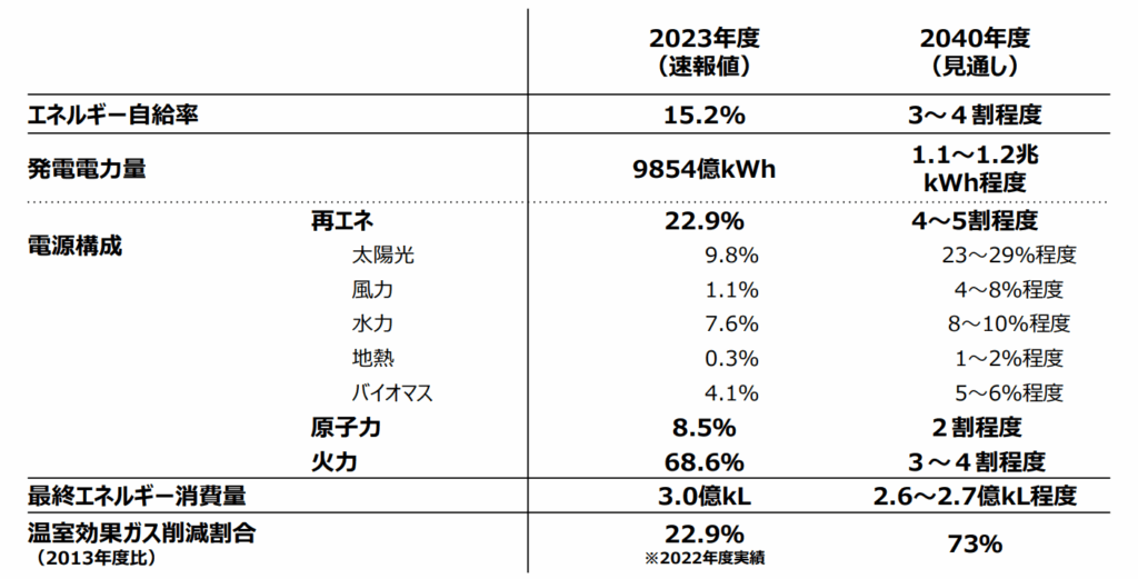第7次エネルギー基本計画では、再生可能エネルギーが「主力電源」として初めて最大の構成比を占めることになりました。特に太陽光発電については、2023年度9.8%から2040年度23~29%と、大幅に増加する見通しが立てられています。