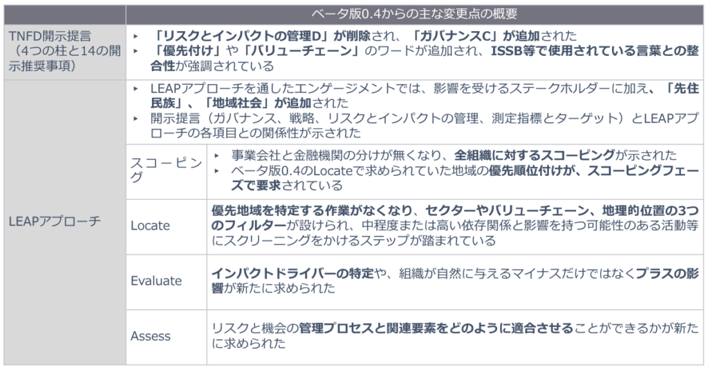 TNFD v1.0では、①Locate、②Evaluate、③Assessにおいてそれぞれ変更がなされました。